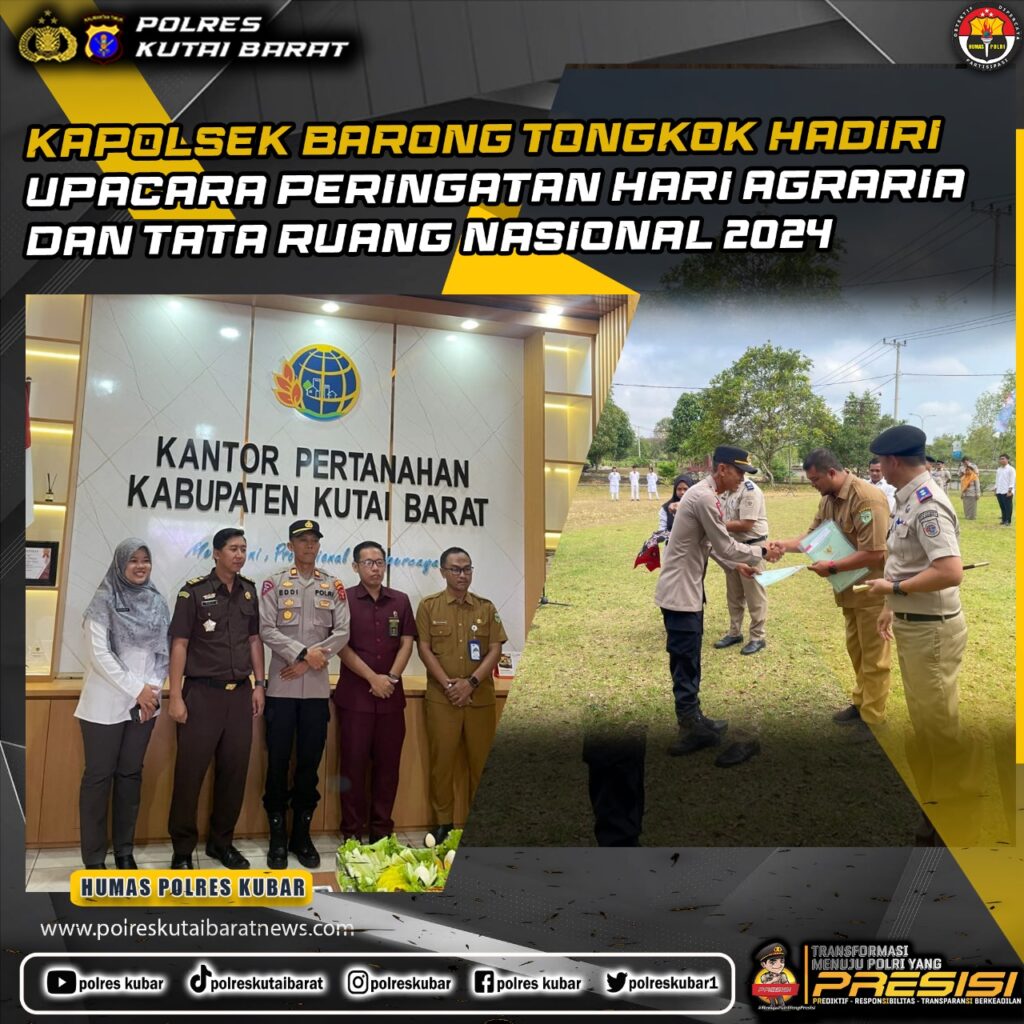 Kapolsek Barong Tongkok, IPTU Edi Subagyo, mewakili Kapolres Kutai Barat AKBP Kade Budiyarta, S.I.K., menyampaikan ucapan selamat atas peringatan Hari Agraria dan Tata Ruang serta hari lahirnya UU Pokok Agraria ke-64. “Semoga momentum ini membawa pelayanan terbaik bagi bangsa dan negara, serta memperkuat komitmen untuk kesejahteraan masyarakat,” ujarnya.