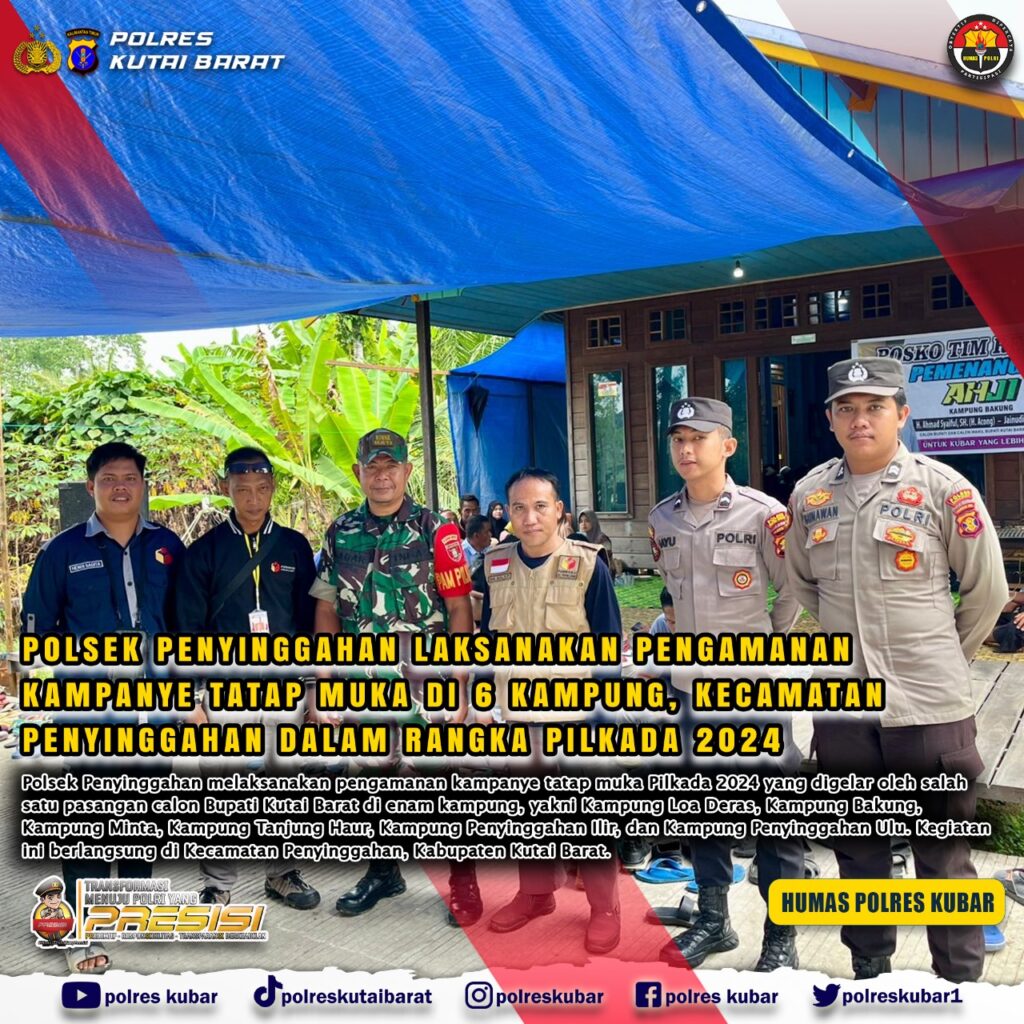 Polsek Penyinggahan melaksanakan pengamanan kampanye tatap muka Pilkada 2024 yang digelar oleh salah satu pasangan calon Bupati Kutai Barat di enam kampung, yakni Kampung Loa Deras, Kampung Bakung, Kampung Minta, Kampung Tanjung Haur, Kampung Penyinggahan Ilir, dan Kampung Penyinggahan Ulu. Kegiatan ini berlangsung di Kecamatan Penyinggahan, Kabupaten Kutai Barat.