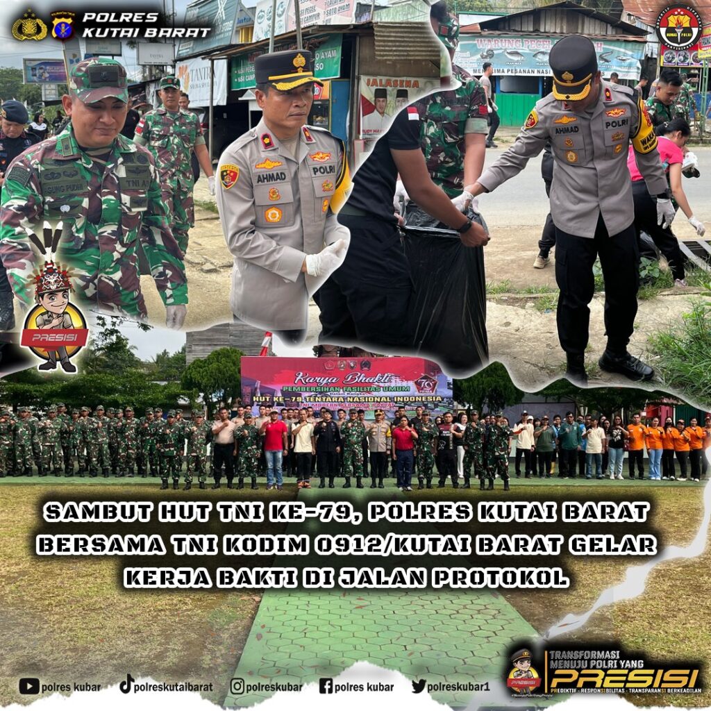 Sambut HUT TNI Ke-79, Polres Kutai Barat Bersama TNI Kodim 0912/Kutai Barat Gelar Kerja Bakti di Jalan Protokol